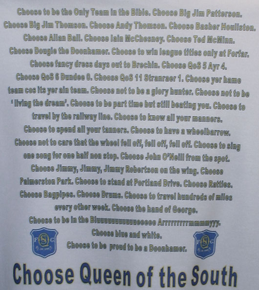 The new Queens T Shirt was selling well yesterday at the Club Shop, the white round neck has the Queen's crest printed on the front and the 'Choose' speech (pictured below) printed on the back. They are available at £12.50 each.